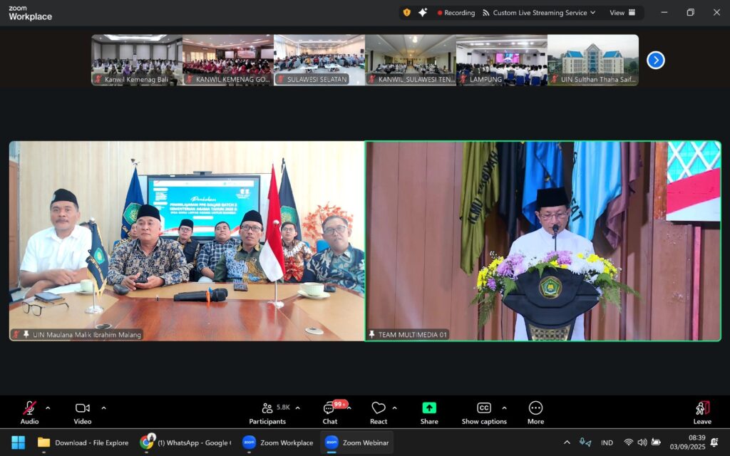 Kementerian Agama Republik Indonesia resmi membuka kegiatan Pembelajaran Pendidikan Profesi Guru (PPG) Dalam Jabatan Transformasi+ Batch 3 Tahun 2025 yang digelar melalui virtual meeting, Rabu, (3/9). Kegiatan ini diikuti secara serentak oleh lebih dari 70 ribu mahasiswa guru dari seluruh Indonesia, termasuk Pengelola PPG LPTK UIN Maulana Malik Ibrahim Malang.