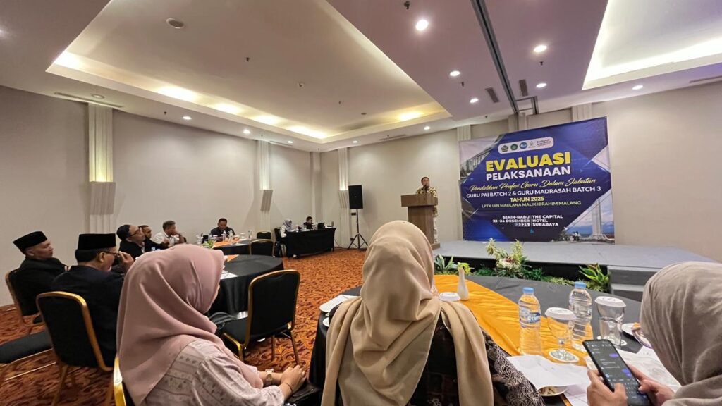 Evaluasi dilaksanakan selama tiga hari, pada 22–24 Desember 2025 di The Capital Hotel Surabaya, Jalan Raya Jemursari No. 258, Surabaya. Kegiatan ini dihadiri oleh pimpinan Fakultas Ilmu Tarbiyah dan Keguruan UIN Maulana Malik Ibrahim Malang, antara lain Prof. Dr. H. Muhammad Walid, M.A. (Dekan), Dr. Drs. M. Yunus, M.Si. (Wakil Dekan I), dan Dr. H. Muhammad In’am Esha, M.Ag. (Wakil Dekan II). Turut hadir Mohammad Miftahusyai’an, M.Sos (Kaprodi PPG), Galih Puji Mulyoto, M.Pd (Sekretaris Prodi PPG), para pengelola, alumni dan tamu undangan lainnya.